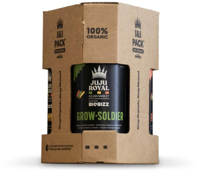 A Biobizz Juju Royal organikus műtrágya kezdőkészletében található 250 ml Grow Soldier növekedési, 250 ml Flowa Bloom virágzási műtrágya és 250 ml Green Mystic stimuláló.