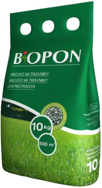 Biopon gyep műtrágya 10 kg Többkomponensű műtrágya, mind az évelő, mind az újonnan létrehozott gyep számára.  A megfelelő fűszaporodáshoz szükséges tápanyagokat tartalmaz, amelyek magas nitrogéntartalom hatására intenzíven szaporodnak és kompakt, erős gyepterületet képeznek.  A műtrágya rendszeres kijuttatása révén a gyep egészséges, sűrű és intenzív zöld színű. Szemcsés műtrágya minden gyeptípushoz. Rendszeres alkalmazása gondoskodik a gyep élénk zöld színéről, megfelelő sűrűségéről és egészséges látványáról.   Műtrágya összetevők