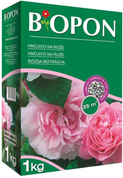 Biopon rózsa műtrágya 1 kg Több összetevőből álló műtrágya nagy tápanyagtartalommal, speciálisan hozzáigazítva minden fajta rózsa szükségleteihez. A kálium a növények általános állapotát javítja és fokozza ellenállóképességüket a téli elfagyással szemben. A magnézium biztosítja a levelek ragyogó zöld színét és a virágok színének élénkségét. Műtrágya összetevők
