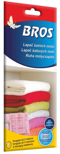 Bros Ruhamoly csapda A szagtalan csapda megszünteti a ruhamolyok jelenlétét a szekrényben és fiókokban. A ragasztóban lévő, csapdát bevonó feromon tartalomnak köszönhetően magához vonzza és sikeresen megfogja a kifejlett hím molylepkéket 3 hónapon keresztül. A termék nem tartalmaz vegyszereket.