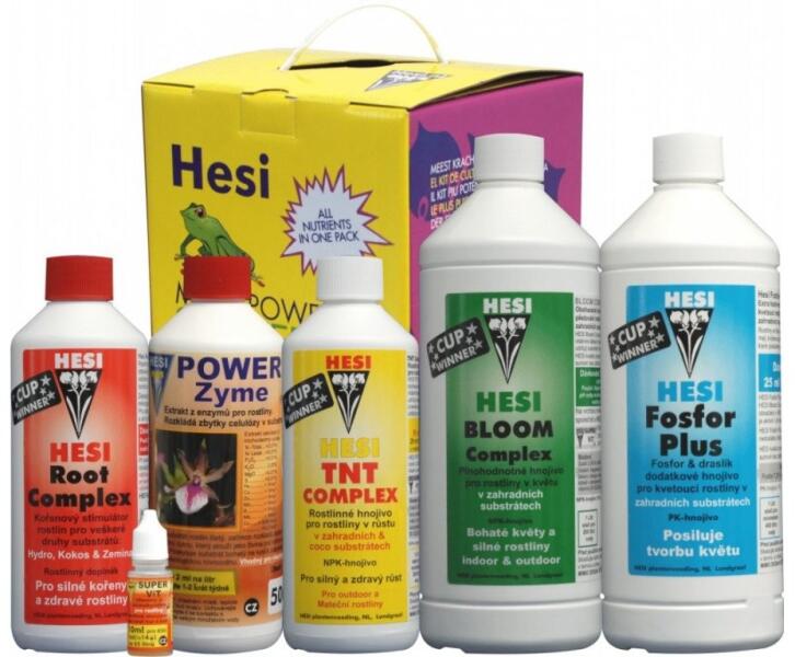 A Hesi Start Box Soil egy teljes tápanyag és adalékanyag készlet a talajban és talaj alapú szubsztrátumokban kezdő termesztők számára. A készletben a következő termékeket találja:1 l Hesi Bloom Complex - univerzális talajtáp NPK típusú, melyet a virágzási fázisban használnak. A műtrágya beltéri növénytermesztők, valamint üvegházi és kerti termesztők számára egyaránt alkalmas. Az EU normáknak megfelel, és csupán minőségi természetes anyagokból készül. Az alaptápanyagok aránya a következő: N-P-K 4-3-5. Emellett a műtrágya vitaminokkal, aminosavakkal, egyszerű cukrokkal és nyomelemekkel (vas, magnézium, cink, réz, bór, molibdén, jód és kobalt) gazdagított. Serkenti a növények növekedését és virágképződését, biztosítva a szükséges energiát, miközben segíti a talaj mikroflóráját. 1 l Hesi Phosphorus Plus - a Hesi sorozat műtrágya-kiegészítője. Extra adag kálium és foszfor az ön növényei számára. Ajánljuk virágzási szakaszban, vagy ha a növények hiánytüneteket mutatnak. Alkalmas beltéri