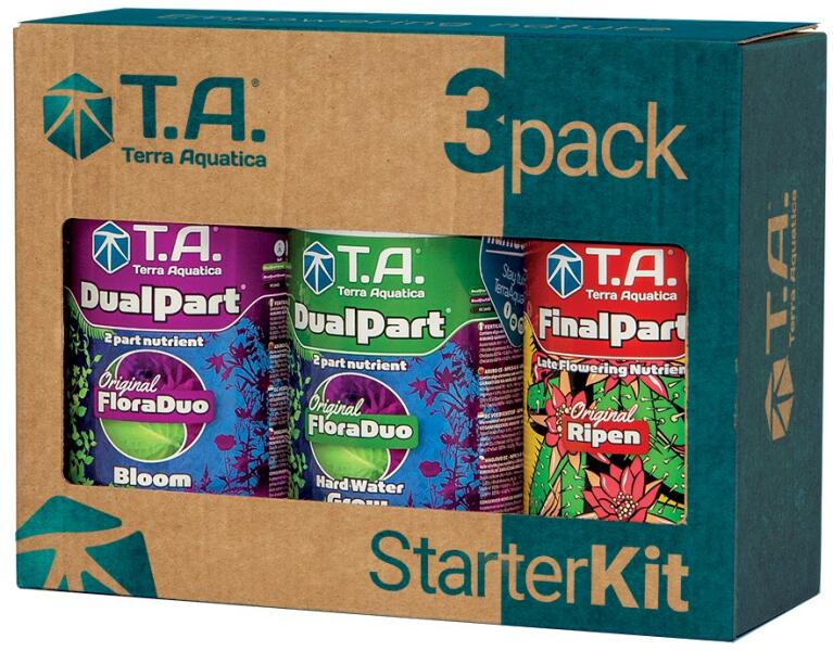 FloraDuo sorozat - egy hármas csomag, amely ideális kezdő készlet. 500ml FloraDuo Grow, 500ml FloraDuo Bloom, 500ml Ripen és pH Down Dry. Ez a készlet lágy vízhez készült.