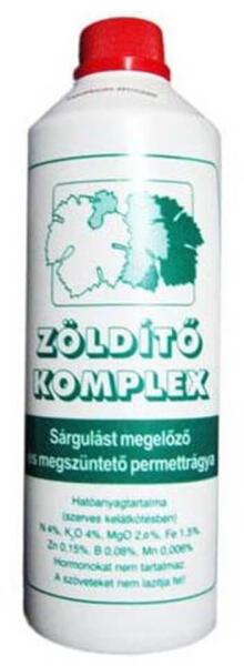 Makro- és mikroelemek szerves kelátkötésben – A Zöldítő komplex 1L lombtrágya makro- és mikroelemeket tartalmaz, amelyek szerves kelátkötésben vannak, így a növények könnyebben fel tudják venni azokat. Fotoszintézis támogatása – Segíti a fotoszintézist és a napenergia jobb hasznosulását, így a növények egészségesebbek és erősebbek lesznek. Növények ellenállóképességének fokozása – Fokozza a növények ellenállóképességét és szöveti szilárdságát, ami különösen fontos a stresszes időszakokban. Széles körű felhasználhatóság – A Zöldítő komplex lombtrágya minden szántóföldi és kertészeti kultúrában használható, különösen ajánlott sárguló növények visszazöldítésére. Jellemzők Kiszerelés 1 literÖsszetétel N 4%, K₂O 4%, MgO 2%, Fe 1,5%, B 0,08%, Zn, Mn szerves kelátkötésbenFelhasználás Minden szántóföldi és kertészeti kultúrában lombtrágyázásraAdagolás 5–10 l/ha, max. 1%-os töménységben; hajtatásban max. 0,5%; sárgulás esetén 3–5 naponként permetezveHatás Klorofiltartalom növelése, fotoszintézis fokozása, jobb termésminőségElőnyök Hormonmentes, nem lazítja a szöveteket, gyors visszazöldítő hatás Egészségesebb növények, gazdagabb termés A Zöldítő komplex 1L használatával a növények élénkebbek, egészségesebbek lesznek, és a termés is gazdagabb és jobb minőségű. A hormonmentes, biológiailag aktív vivőanyag biztosítja, hogy a növények szövetei ne lazuljanak fel, így hosszú távon is megőrzik ellenállóképességüket. Rendszeres használat előnyei A tenyészidőszakban 2–3 alkalommal, 10–14 naponta, sárgulás esetén 3–5 naponként javasolt kipermetezni. Ezzel a rendszeres kezeléssel biztosíthatod, hogy növényeid mindig a legjobb formájukat hozzák, és a terméshozam is maximális legyen. Gyakori kérdések Milyen növényekhez használható? Minden szántóföldi és kertészeti kultúrában alkalmazható. Milyen gyakran kell alkalmazni? A tenyészidőszakban 2–3 alkalommal, sárgulás esetén 3–5 naponként. Milyen hatással van a növényekre? Növeli a klorofiltartalmat, erősíti a növényeket és javítja a terméshozamot.